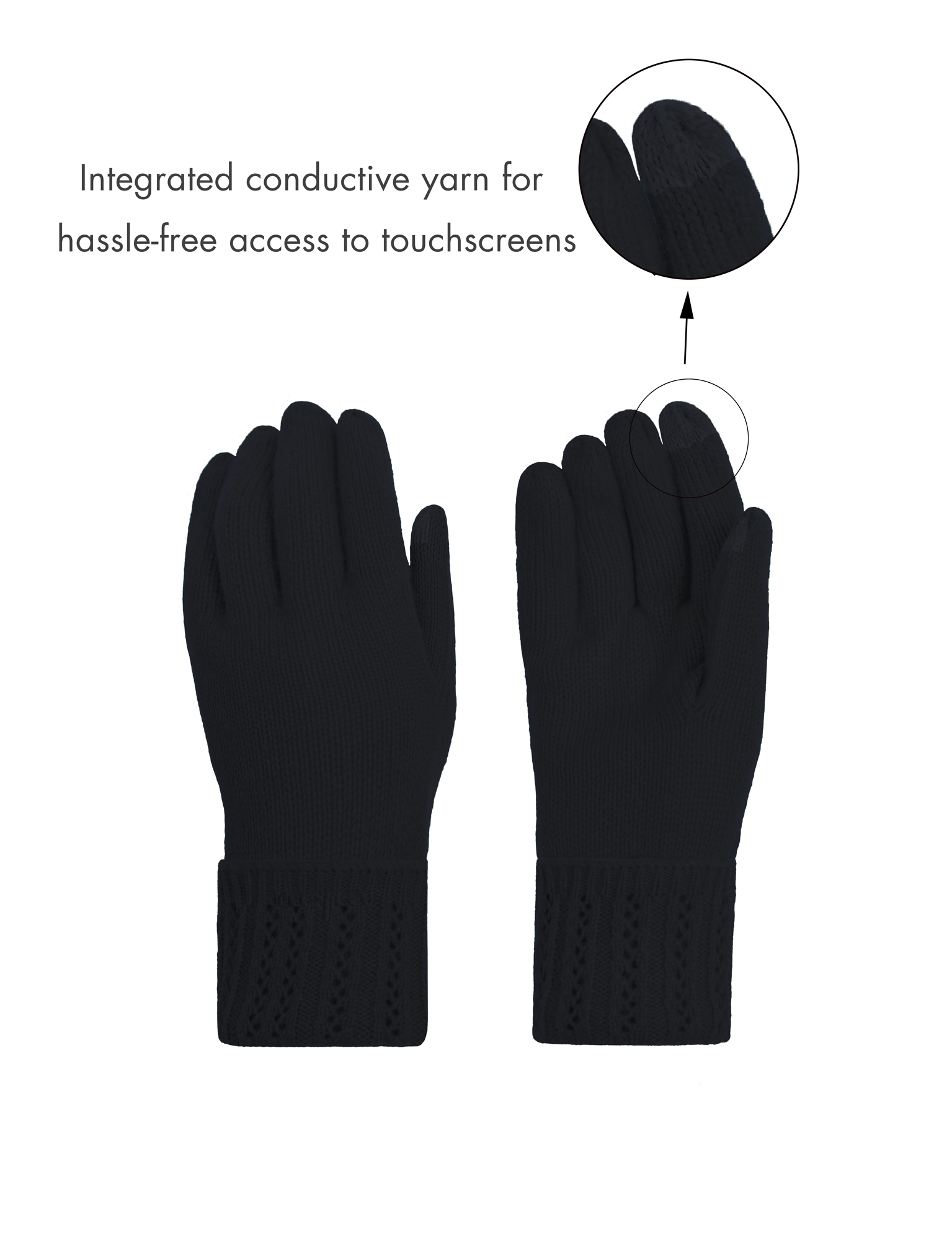 The intelligently integrated conductive yarn on the inside tips of both index fingers and thumbs allows you the convenience of hassle-free access to touchscreens.